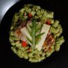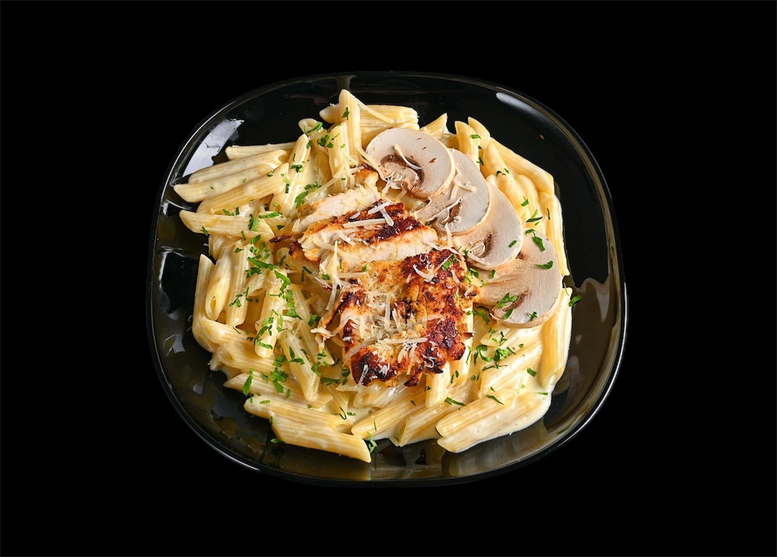 معكرونة بيني، دجاج مشوي، فطر، كمأة، صلصة كريمية، تقدم مع جبنة بارميزان.